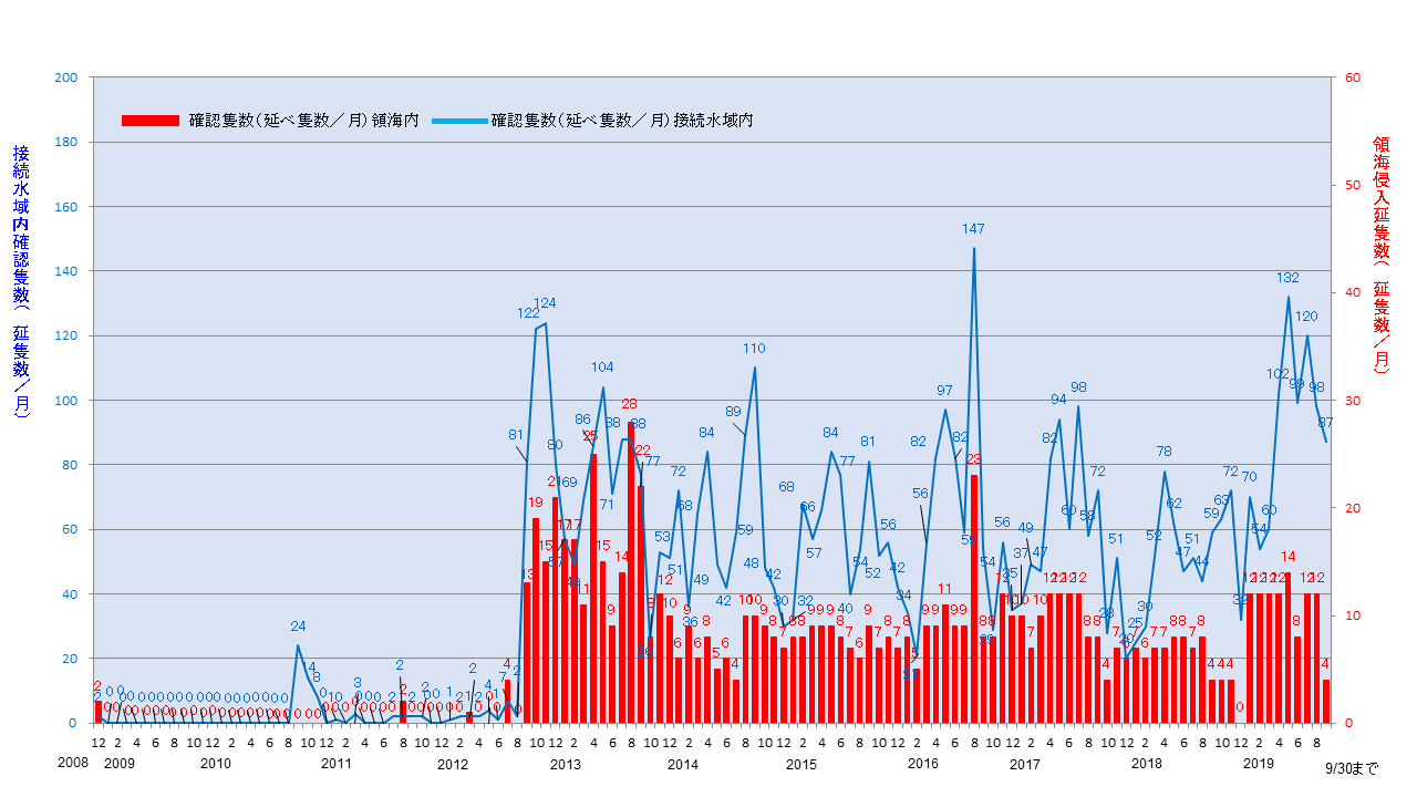 しかも、中国公船の日本領海侵入は、確かにかなりの数があるものの、海上保安庁のサイトには「中国公船が我が国の主権を侵害する明確な意図をもって航行し、実力によって現状変更を試みるという、尖閣諸島をめぐり従来には見られなかった中国の新たな姿勢が明らかになった」