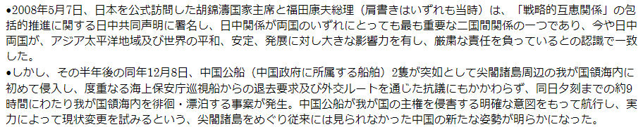 のは自民党政権時代の2012年12月8日のこととされている。しかも、「日本の海上保安庁の船に『ここは中国の領海です。出ていきなさい』と言っている」