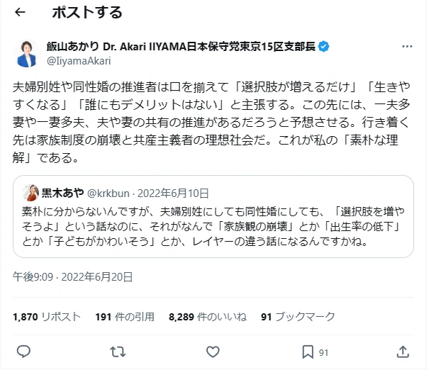 伝統的な家族のあり方が崩れるからというのは、飯山陽氏に対する批判で述べたので繰り返さない。