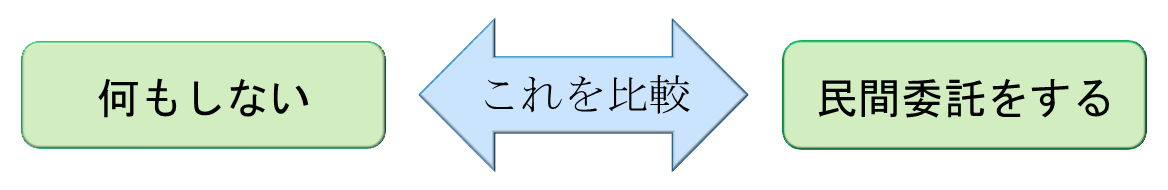実際には、次の2つを比較するべきなのである。なお、ここにいうコストはたんなる金銭的なものに限られない。民間委託を行うための様々な"手間"が含まれる。