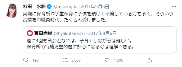 では、政府自民党の保育所に関する意識はどうかと言えば、これは自民党の杉田水脈議員のTwitterなどでの発言を見ればよく分かろうと言うものである。保育所は不倫の手段という発想なのだ。