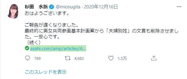 これにブレーキをかけたのが、杉田水脈議員らである。「男女共同参画基本計画」の「選択的夫婦別氏制度」に関する記述に対して、原案の「必要な対応を進める」を「更なる検討を進める」に修正したばかりか「夫婦別氏」という言葉を削除してしまったのである。杉田氏は、勝ち誇ったようにツイートしている。
